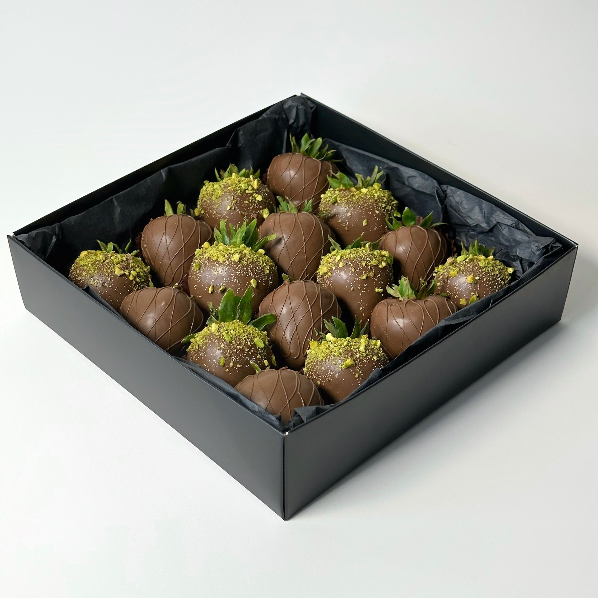 Enjoy a box of chocolate-covered strawberries dipped in milk chocolate with pistachio. Each bite is a perfect blend of sweetness and elegance. Treat yourself or someone special to this delicious delight!