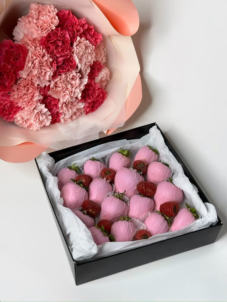 Meet “Isabella”—the ultimate gift of sweetness and charm, featuring Carnations bouquet and a custom box of 16 chocolate covered strawberries.