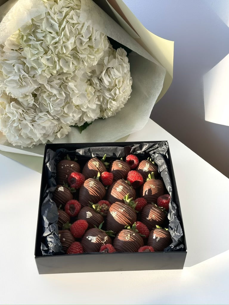 This stunning gift set includes a bouquet of lush, cloud-like hydrangeas and a box of decadent chocolate-covered strawberries. Whether it’s for a celebration, a romantic gesture, or just to treat someone special, “Amelia” delivers both beauty and sweetness in one unforgettable package. With its fresh, vibrant blooms and gourmet chocolate delights, this duo is guaranteed to brighten their day and satisfy their sweet tooth!